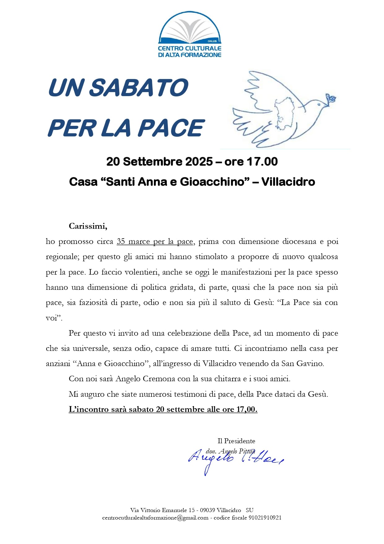 UN SABATO PER LA PACE - 20 SETTEMBRE 2025 ORE 17.00 Il Centro Culturale e di Alta Formazione per sabato 20 settembre 2025 promuove e invita alla celebrazione della pace con "Un sabato per la Pace", un momento di pace universale, senza odio e capace di amare tutti con la partecipazione di Angelo Cremona con la sua chitarra e in suoi amici. Appuntamento Sabato 20 settembre alle ore 17.00 presso la "Casa Santi Anna e Gioacchino" a Villacidro.