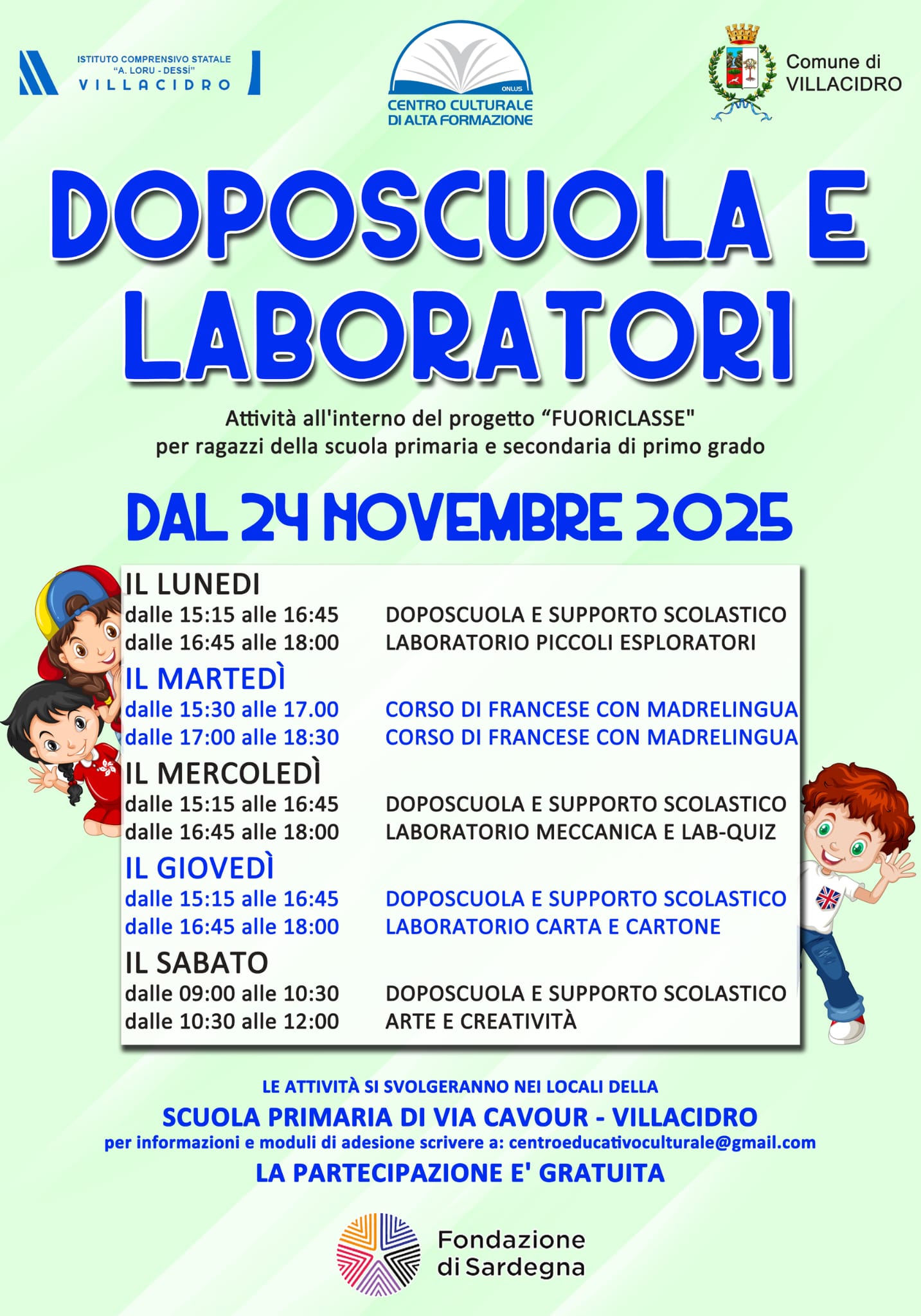 Associazione Centro Culturale e di Alta Formazione APSATTIVITÀ EXTRASCOLASTICHE- PROGETTO “FUORICLASSE” Il Centro Culturale e di Alta Formazione, insieme all' Istituto Comprensivo "A. Loru - Dessì" Villacidro e al Comune di Villacidro, è felice di presentare la nuova attività dedicata a studenti e studentesse della scuola primaria e secondaria di primo grado: Per Info e iscrizioni