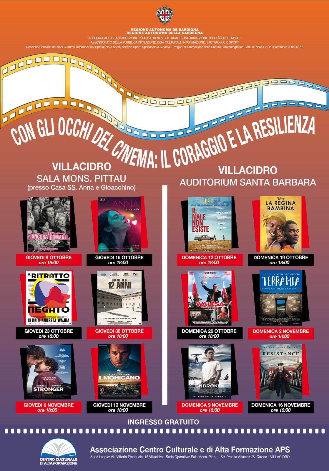Dal 3 ottobre al 10 novembre 2024, il giovedì e la domenica alle ore 18.00 al Palazzo Vescovile in Via Vittorio Emanuele 15 a Villacidro. L'ingresso è gratuito. Progetto in collaborazione con "Libera Associazione nomi e numeri contro le mafie - Sardegna" Libera Sardegna e con "Associazione La Strada - Cagliari" e sostenuto dalla Regione Autonoma della Sardegna, Assessorato della Pubblica Istruzione, Beni Culturali, Informazione, Spettacolo e Sport, Progetti di promozione della cultura cinematografica, art.15.R. 20 settembre 2006 N.15, annualità 2024