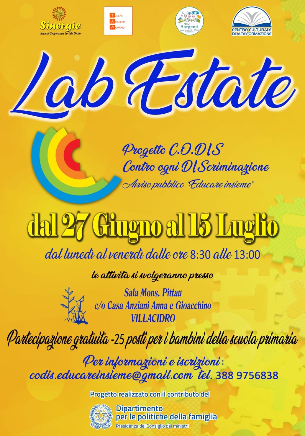 ATTIVITÀ ESTIVE "LabEstate" GIUGNO-LUGLIO 2022 La Cooperativa Sinergie Onlus in partenariato con l'Associazione Centro Culturale e di Alta Formazione APS, la Cooperativa Sociale Alle Sorgenti Progetto A e la Talent Academy Working, propone un bellissimo progetto ad ampio respiro che si realizzerà all'interno del nostro territorio nei comuni di Villacidro, Guspini e Terralba. |
