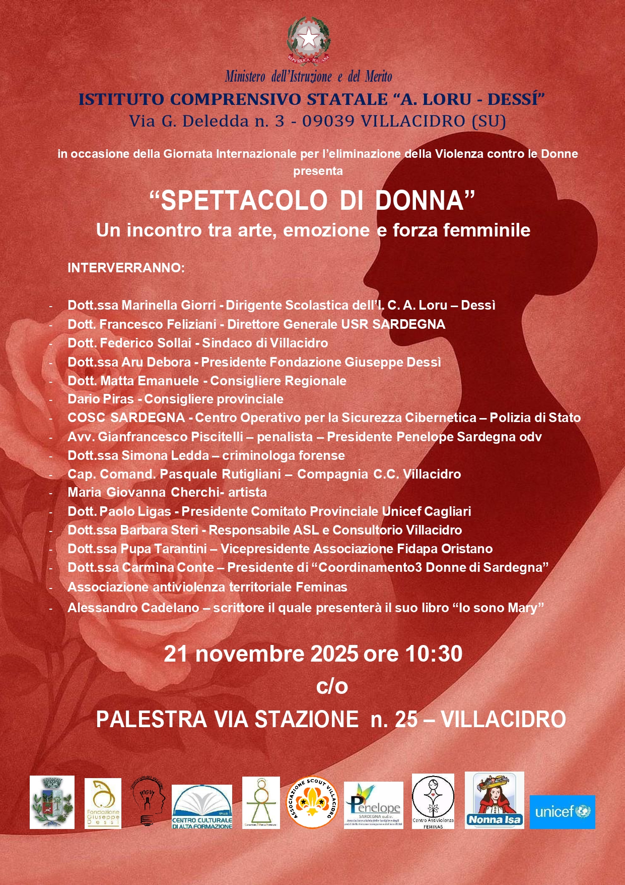 GIORNATA INTERNAZIONALE PER L'ELIMINAZIONE DELLA VIOLENZA CONTRO LE DONNE In occasione della Giornata Internazionale per l'eliminazione della violenza contro le Donne il "Centro Culturale e di Alta Formazione" sarà partner di questa importante iniziativa organizzata dall' Istituto Comprensivo "A. Loru - Dessì" Villacidro che presenta "Spettacolo di Donna" un incontro tra arte, emozioni e forza femminile.