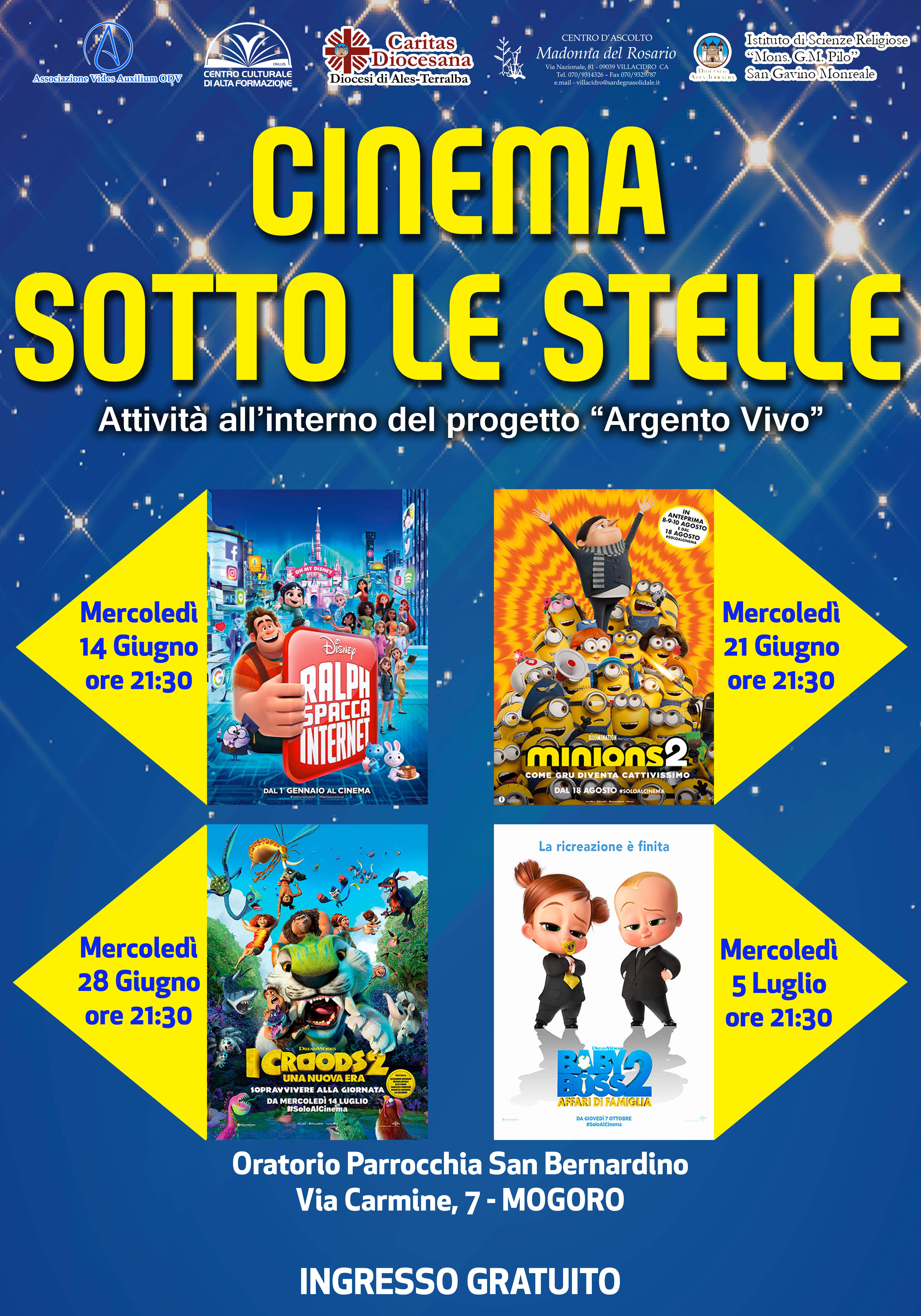 A Mogoro il Centro Culturale e di Alta Formazione, in partnership con la Caritas della Diocesi di Ales Terralba, il Centro d'ascolto Madonna del Rosario, l'Istituto di Scienze Religiose Mons. G.M.Pilo e l'associazione Vides Auxilium ODV, presentano la rassegna cinematografica "Cinema Sotto le stelle", 4 imperdibili film di animazione dal 14 giugno per 4 mercoledi alle ore 21.30 nel cortile dell'oratorio Parrocchia San Bernardino in Via Carmine 7 a Mogoro.